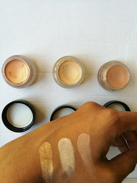Side by side... The Mac paint pots from left to right are rubinesque as discussed above, a coral gold colour, then is soft ochre, which is yellow toned and layin low which is brown with a pinkish undertone...
